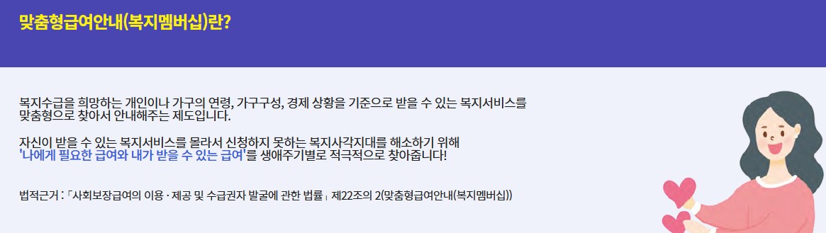 복지멤버십은 정부가 제공하는 맞춤형 복지 혜택을 자동으로 안내받을 수 있는 서비스입니다. 기존에는 본인이 직접 복지서비스를 검색하고 신청해야 했지만, 복지멤버십에 가입하면 받을 수 있는 복지 혜택을 자동으로 추천받고, 간편하게 신청할 수 있습니다.